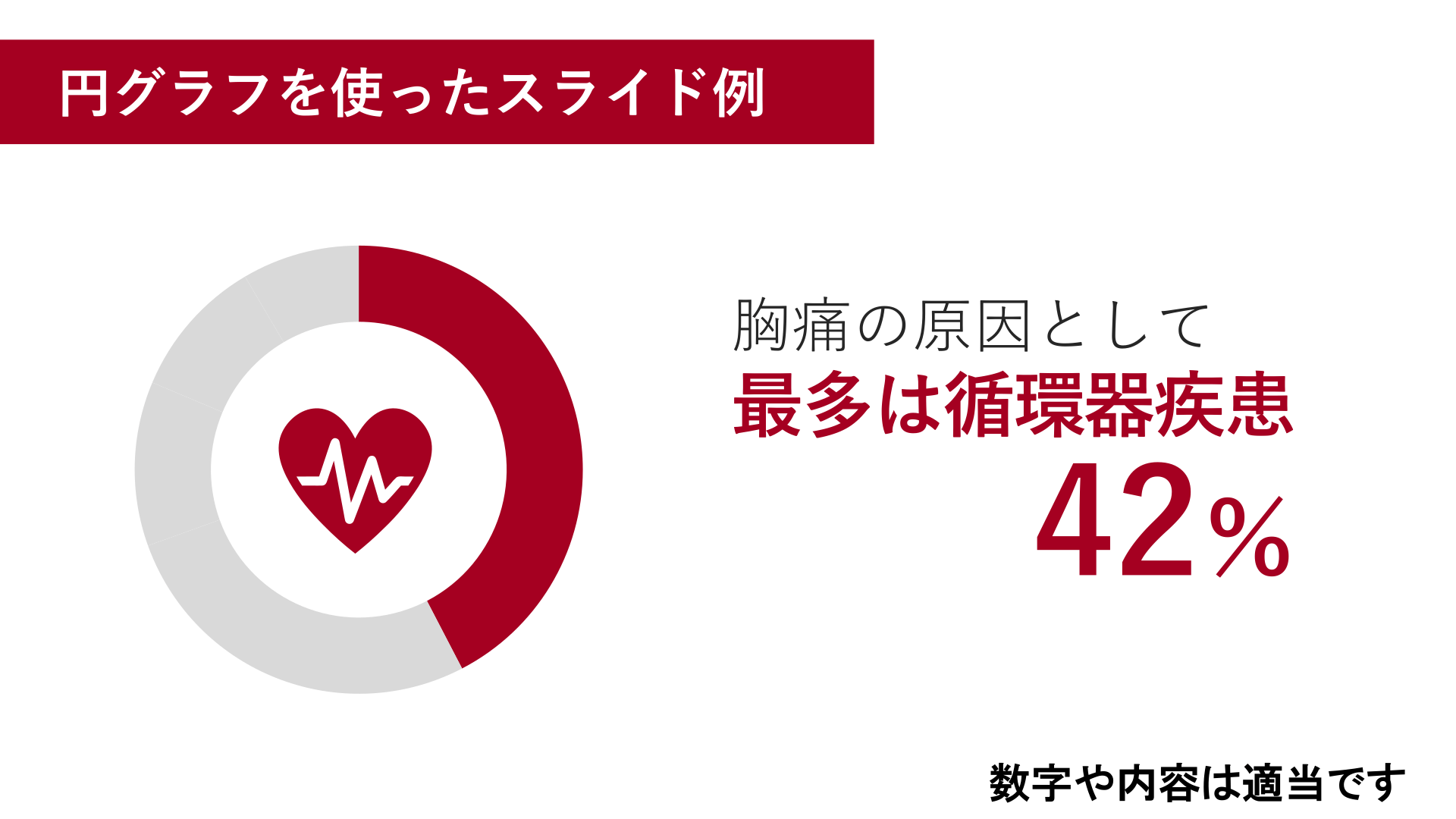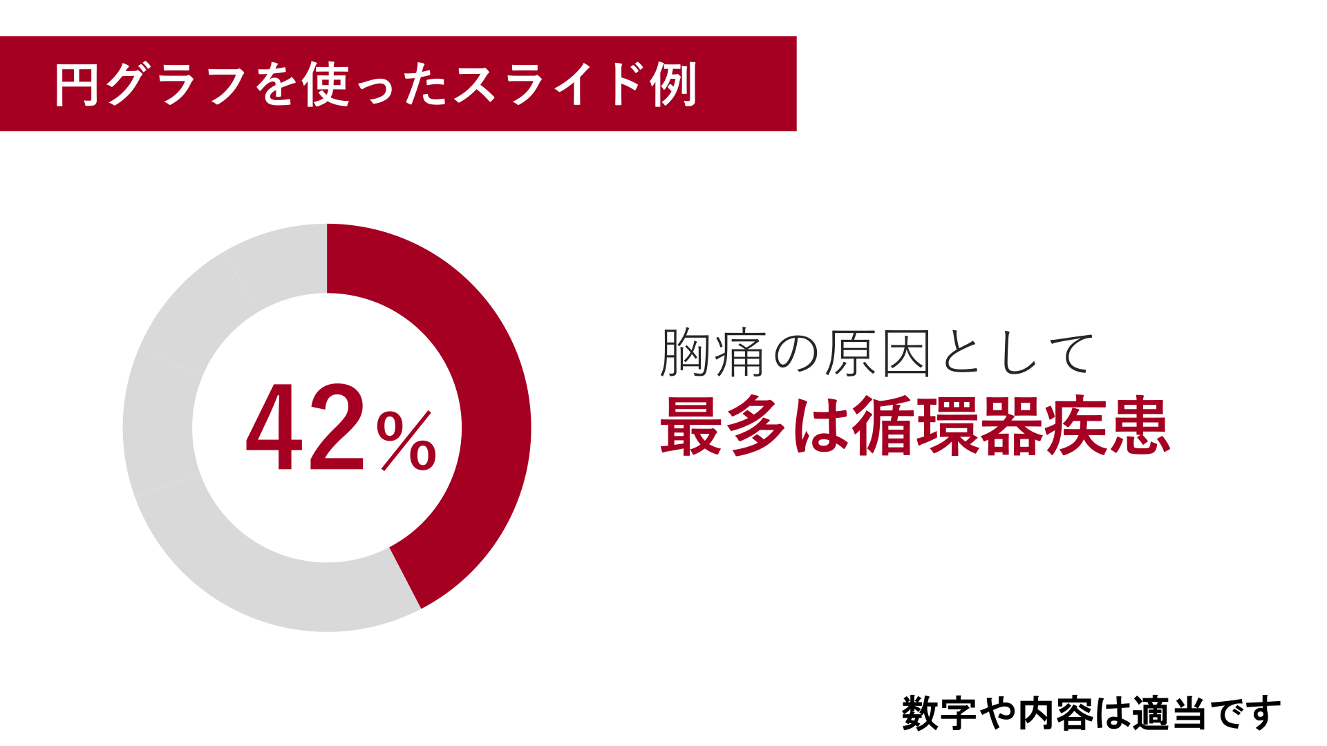 #9. 円グラフを使ったスライド例 胸痛の原因として 最多は循環器疾患 42% 数字や内容は適当です