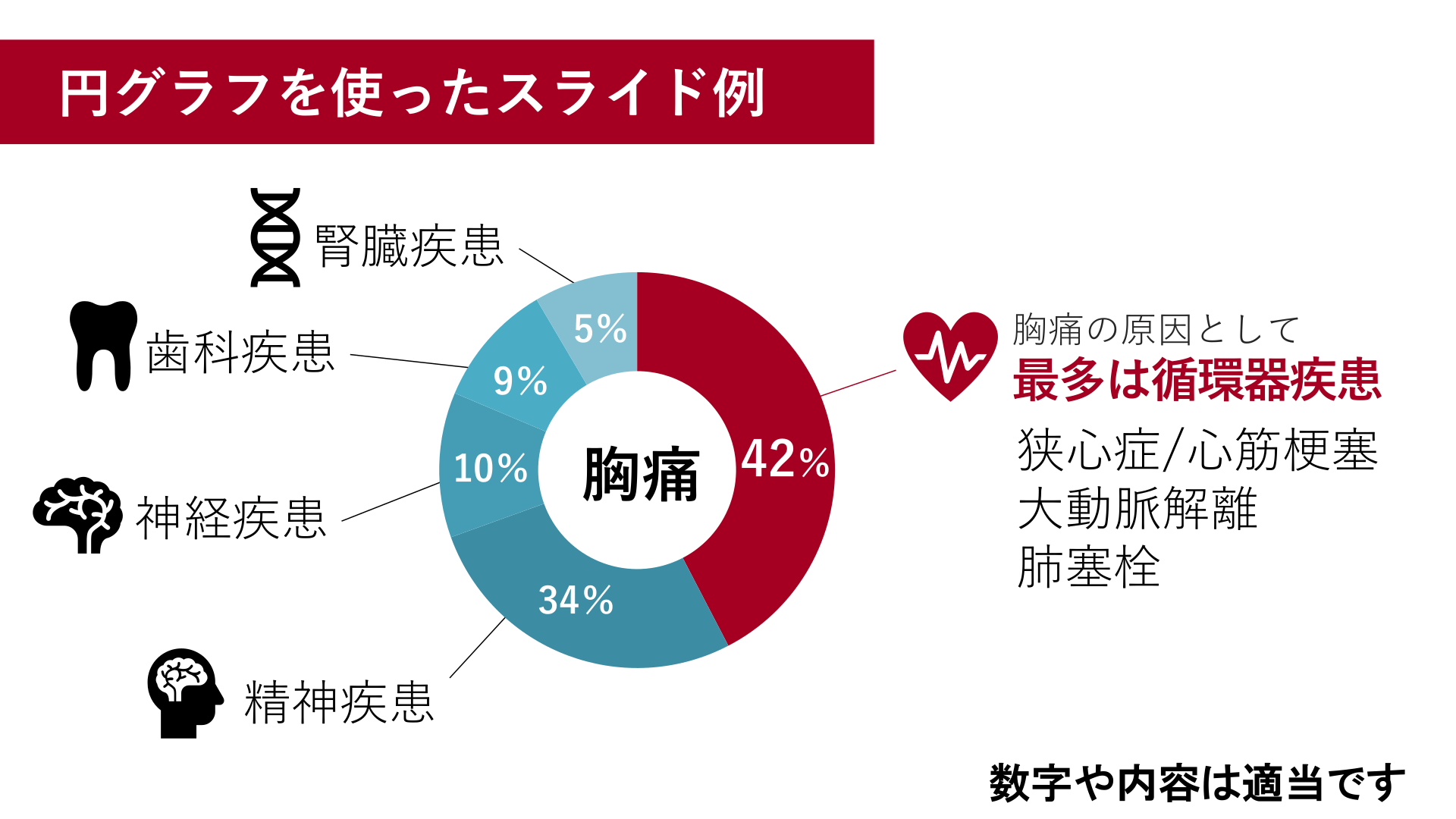 #8. 円グラフを使ったスライド例 腎臓疾患 歯科疾患 胸痛の原因として 胸痛 42% 最多は循環器疾患 狭心症/心筋梗塞 大動脈解離 肺塞栓 9% 10% 神経疾患 5% 34% 精神疾患 数字や内容は適当です