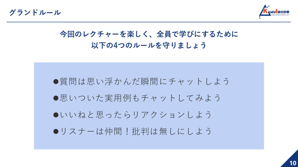#10. グランドルール 今回のレクチャーを楽しく、全員で学びにするために 以下の4つのルールを守りましょう ⚫質問は思い浮かんだ瞬間にチャットしよう ⚫思いついた実用例もチャットしてみよう ⚫いいねと思ったらリアクションしよう ⚫リスナーは仲間!批判は無しにしよう 10
