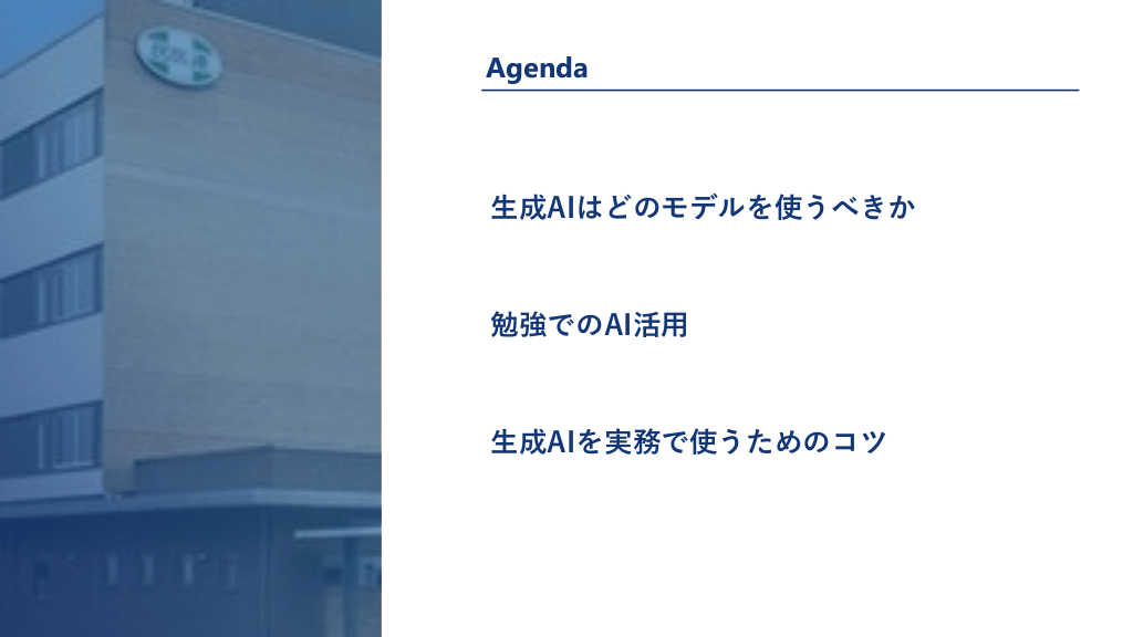 #11. Agenda 生成AIはどのモデルを使うべきか 勉強でのAI活用 生成AIを実務で使うためのコツ