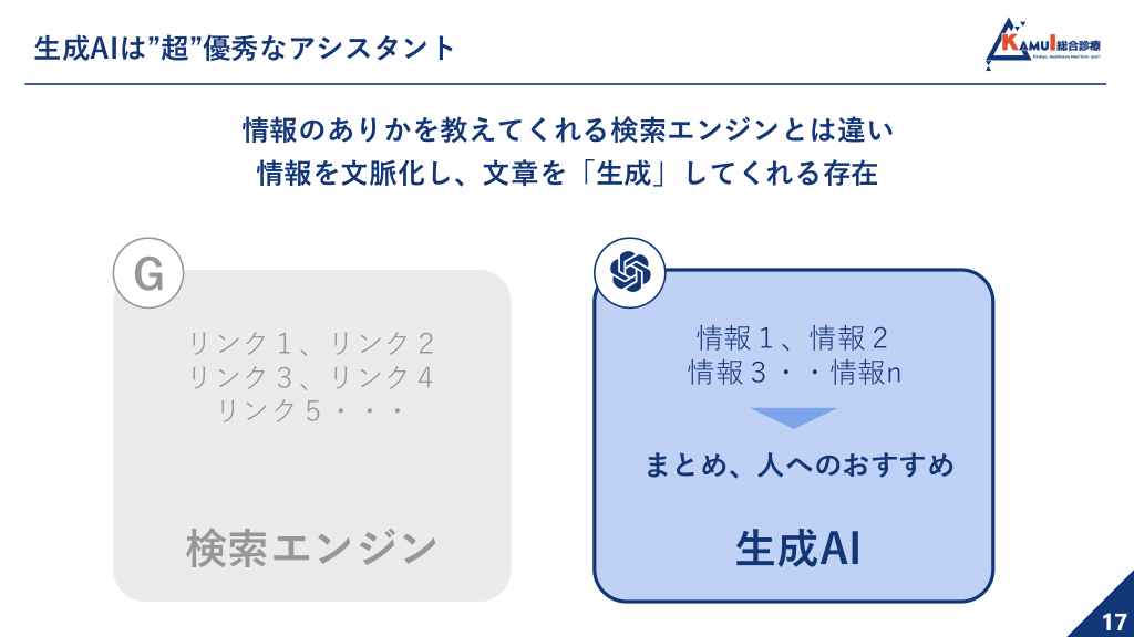 #17. 生成AIは”超”優秀なアシスタント 情報のありかを教えてくれる検索エンジンとは違い 情報を文脈化し、文章を「生成」してくれる存在 G リンク1、リンク2 リンク3、リンク4 リンク5・・・ 情報1、情報2 情報3・・情報n まとめ、人へのおすすめ 検索エンジン 生成AI 17