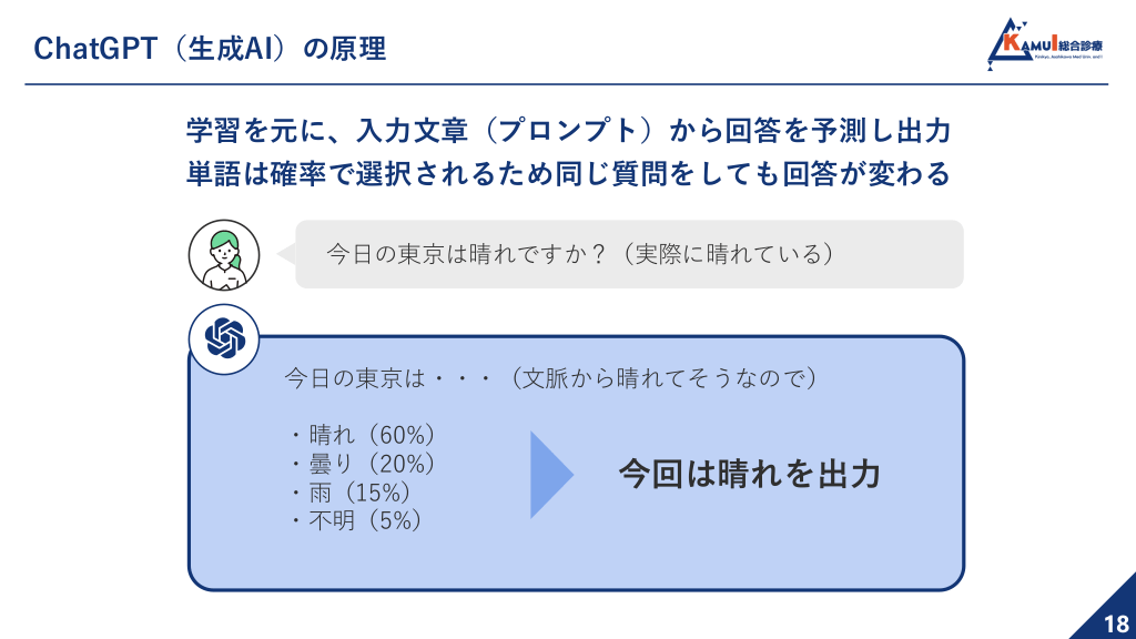 #18. ChatGPT(生成AI)の原理 学習を元に、入力文章(プロンプト)から回答を予測し出力 単語は確率で選択されるため同じ質問をしても回答が変わる 今日の東京は晴れですか?(実際に晴れている) 今日の東京は・・・(文脈から晴れてそうなので) ・晴れ(60%) ・曇り(20%) ・雨(15%) ・不明(5%) 今回は晴れを出力 18
