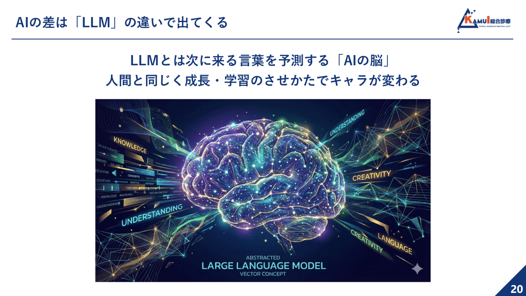 #20. AIの差は「LLM」の違いで出てくる LLMとは次に来る言葉を予測する「AIの脳」 人間と同じく成長・学習のさせかたでキャラが変わる 20