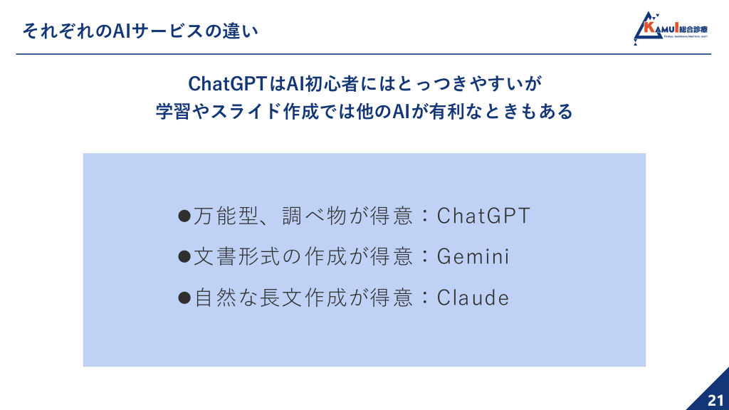 #21. それぞれのAIサービスの違い ChatGPTはAI初心者にはとっつきやすいが 学習やスライド作成では他のAIが有利なときもある ⚫万能型、調べ物が得意:ChatGPT ⚫文書形式の作成が得意:Gemini ⚫自然な長文作成が得意:Claude 21
