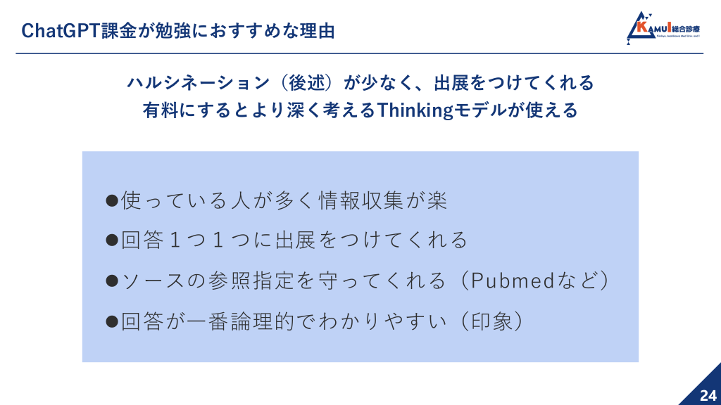 #24. ChatGPT課金が勉強におすすめな理由 ハルシネーション(後述)が少なく、出展をつけてくれる 有料にするとより深く考えるThinkingモデルが使える ⚫使っている人が多く情報収集が楽 ⚫回答1つ1つに出展をつけてくれる ⚫ソースの参照指定を守ってくれる(Pubmedなど) ⚫回答が一番論理的でわかりやすい(印象) 24