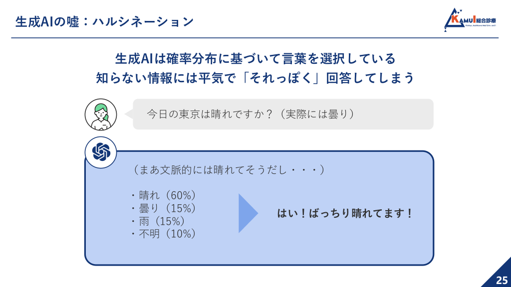#25. 生成AIの嘘:ハルシネーション 生成AIは確率分布に基づいて言葉を選択している 知らない情報には平気で「それっぽく」回答してしまう 今日の東京は晴れですか?(実際には曇り) (まあ文脈的には晴れてそうだし・・・) ・晴れ(60%) ・曇り(15%) ・雨(15%) ・不明(10%) はい!ばっちり晴れてます! 25
