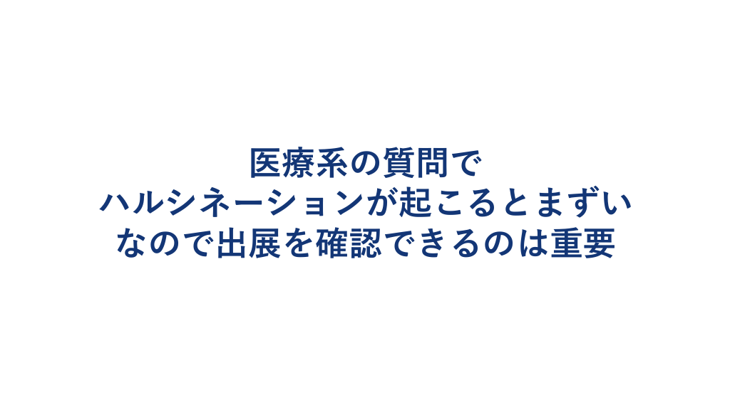 #26. 医療系の質問で ハルシネーションが起こるとまずい なので出展を確認できるのは重要