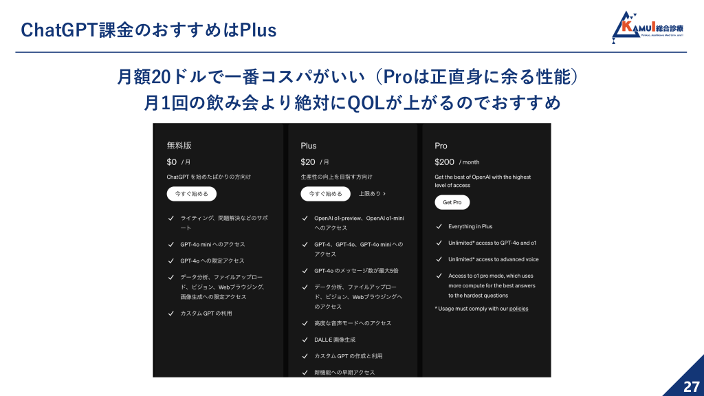 #27. ChatGPT課金のおすすめはPlus 月額20ドルで一番コスパがいい(Proは正直身に余る性能) 月1回の飲み会より絶対にQOLが上がるのでおすすめ 27