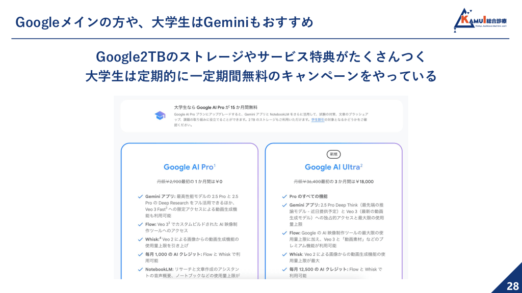 #28. Googleメインの方や、大学生はGeminiもおすすめ Google2TBのストレージやサービス特典がたくさんつく 大学生は定期的に一定期間無料のキャンペーンをやっている 28