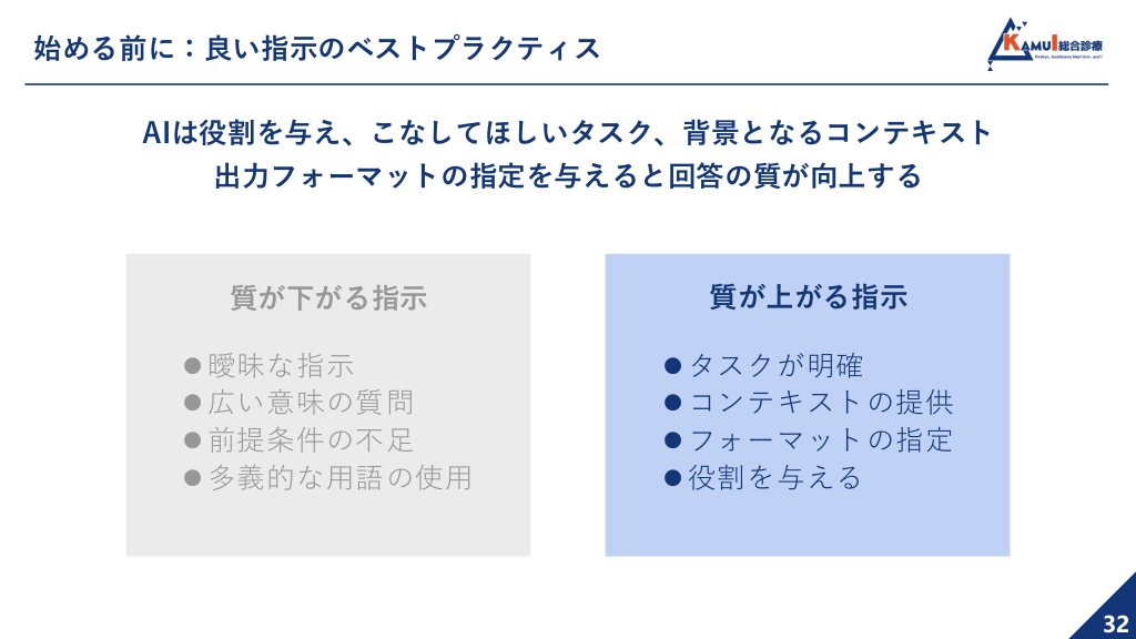 #32. 始める前に:良い指示のベストプラクティス AIは役割を与え、こなしてほしいタスク、背景となるコンテキスト 出力フォーマットの指定を与えると回答の質が向上する 質が下がる指示 質が上がる指示 ⚫ 曖昧な指示 ⚫ 広い意味の質問 ⚫ 前提条件の不足 ⚫ 多義的な用語の使用 ⚫ タスクが明確 ⚫ コンテキストの提供 ⚫ フォーマットの指定 ⚫ 役割を与える 32