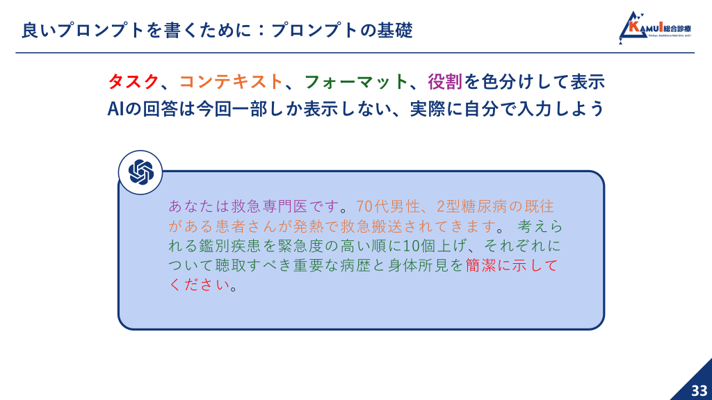 #33. 良いプロンプトを書くために:プロンプトの基礎 タスク、コンテキスト、フォーマット、役割を色分けして表示 AIの回答は今回一部しか表示しない、実際に自分で入力しよう あなたは救急専門医です。70代男性、2型糖尿病の既往 がある患者さんが発熱で救急搬送されてきます。 考えら れる鑑別疾患を緊急度の高い順に10個上げ、それぞれに ついて聴取すべき重要な病歴と身体所見を簡潔に示して ください。 33