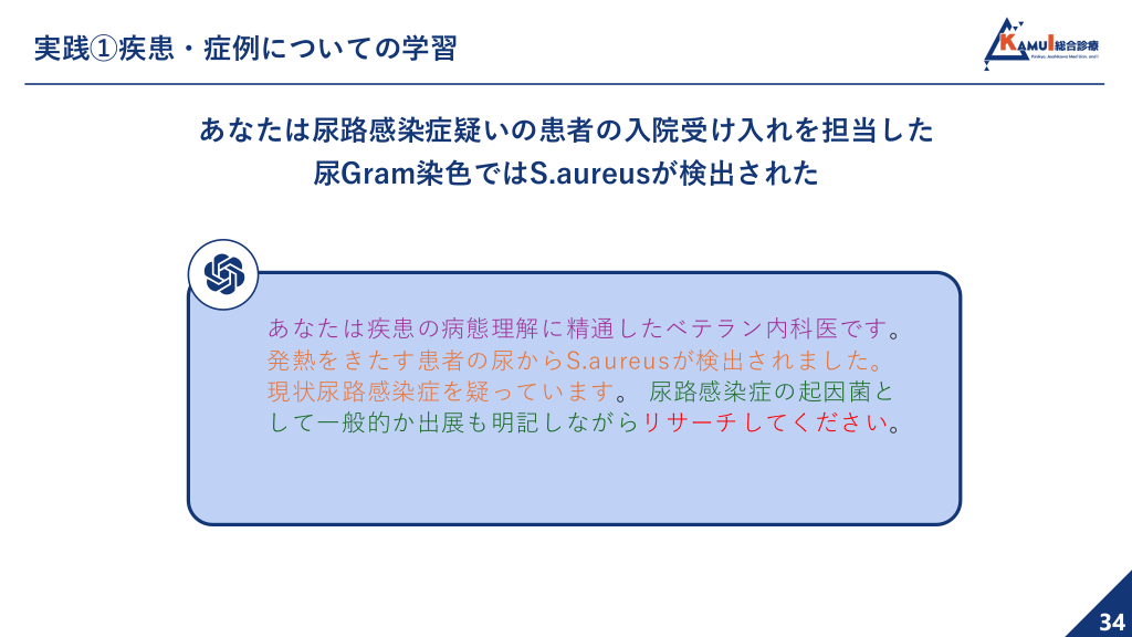 #34. 実践①疾患・症例についての学習 あなたは尿路感染症疑いの患者の入院受け入れを担当した 尿Gram染色ではS.aureusが検出された あなたは疾患の病態理解に精通したベテラン内科医です。 発熱をきたす患者の尿からS.aureusが検出されました。 現状尿路感染症を疑っています。 尿路感染症の起因菌と して一般的か出展も明記しながらリサーチしてください。 34