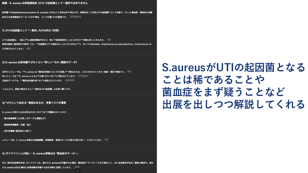 #35. S.aureusがUTIの起因菌となる ことは稀であることや 菌血症をまず疑うことなど 出展を出しつつ解説してくれる