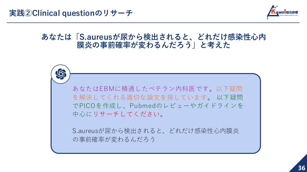 #36. 実践②Clinical questionのリサーチ あなたは「S.aureusが尿から検出されると、どれだけ感染性心内 膜炎の事前確率が変わるんだろう」と考えた あなたはEBMに精通したベテラン内科医です。以下疑問 を解決してくれる適切な論文を探しています。 以下疑問 でPICOを作成し、Pubmedのレビューやガイドラインを 中心にリサーチしてください。 S.aureusが尿から検出されると、どれだけ感染性心内膜炎 の事前確率が変わるんだろう 36