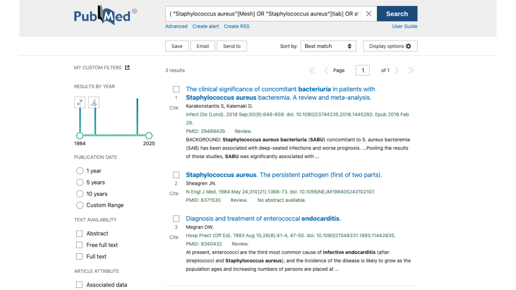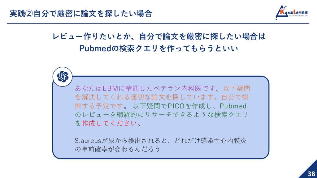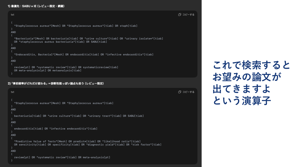 #38. 実践②自分で厳密に論文を探したい場合 レビュー作りたいとか、自分で論文を厳密に探したい場合は Pubmedの検索クエリを作ってもらうといい あなたはEBMに精通したベテラン内科医です。以下疑問 を解決してくれる適切な論文を探しています。自分で検 索する予定です。 以下疑問でPICOを作成し、Pubmed のレビューを網羅的にリサーチできるような検索クエリ を作成してください。 S.aureusが尿から検出されると、どれだけ感染性心内膜炎 の事前確率が変わるんだろう 38