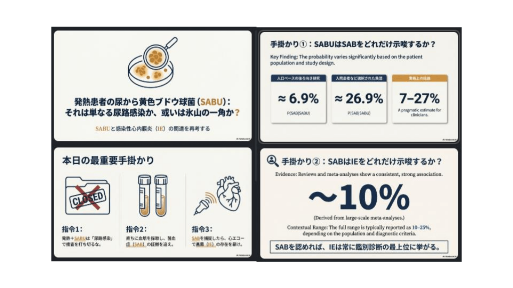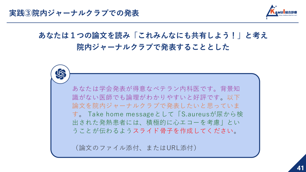 #41. 実践③院内ジャーナルクラブでの発表 あなたは1つの論文を読み「これみんなにも共有しよう!」と考え 院内ジャーナルクラブで発表することとした あなたは学会発表が得意なベテラン内科医です。背景知 識がない医師でも論理がわかりやすいと好評です。以下 論文を院内ジャーナルクラブで発表したいと思っていま す。 Take home messageとして「S.aureusが尿から検 出された発熱患者には、積極的に心エコーを考慮」とい うことが伝わるようスライド骨子を作成してください。 (論文のファイル添付、またはURL添付) 41
