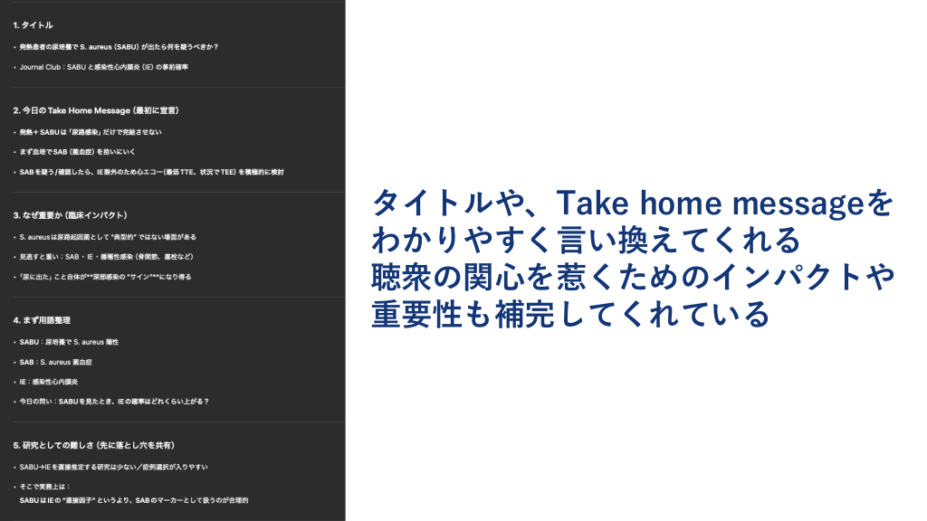 #42. タイトルや、Take home messageを わかりやすく言い換えてくれる 聴衆の関心を惹くためのインパクトや 重要性も補完してくれている
