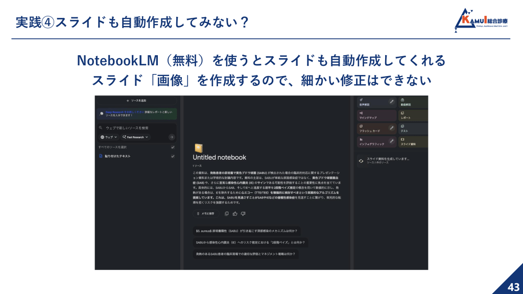 #43. 実践④スライドも自動作成してみない? NotebookLM(無料)を使うとスライドも自動作成してくれる スライド「画像」を作成するので、細かい修正はできない 43