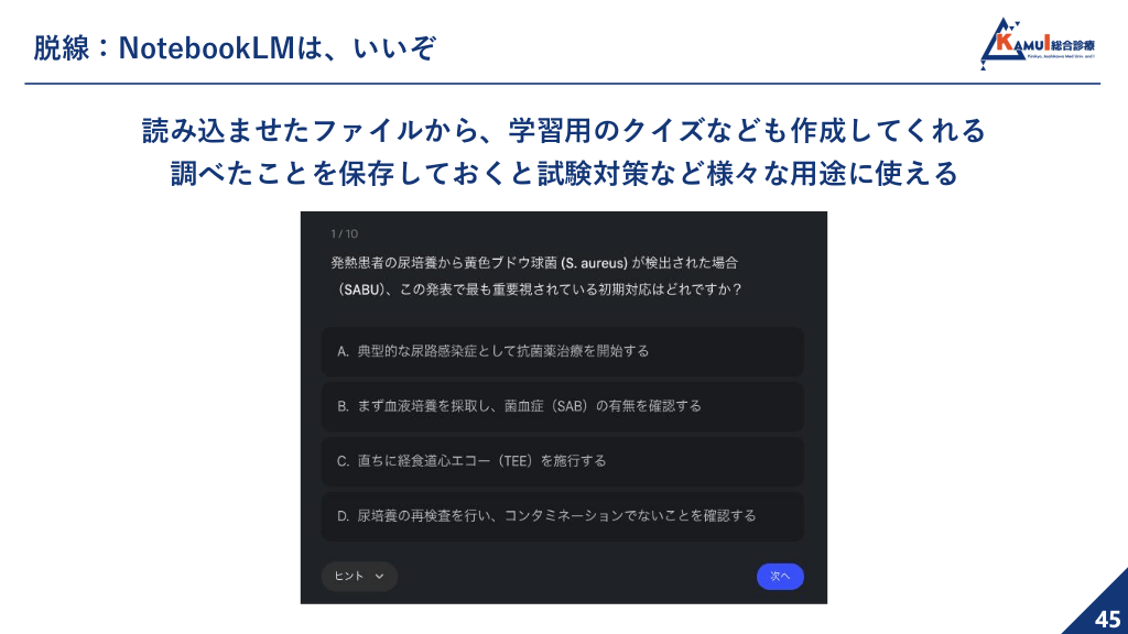#45. 脱線:NotebookLMは、いいぞ 読み込ませたファイルから、学習用のクイズなども作成してくれる 調べたことを保存しておくと試験対策など様々な用途に使える 45