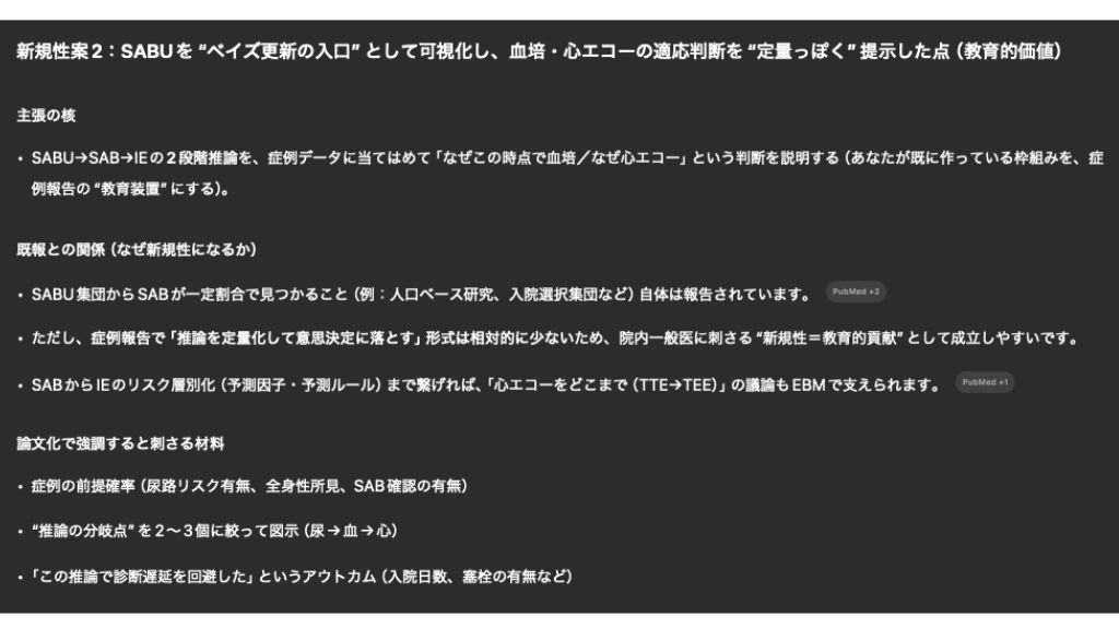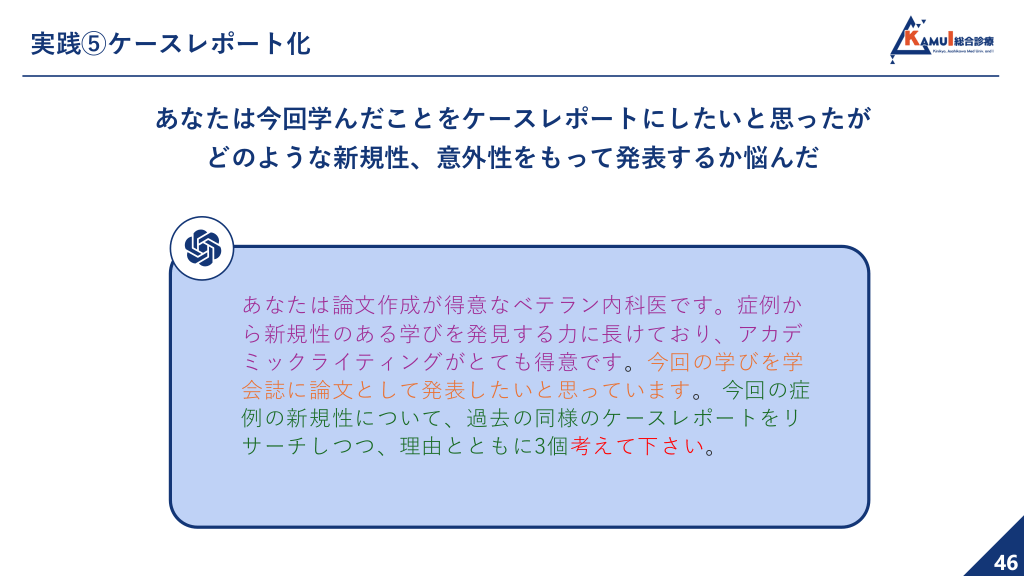 #46. 実践⑤ケースレポート化 あなたは今回学んだことをケースレポートにしたいと思ったが どのような新規性、意外性をもって発表するか悩んだ あなたは論文作成が得意なベテラン内科医です。症例か ら新規性のある学びを発見する力に長けており、アカデ ミックライティングがとても得意です。今回の学びを学 会誌に論文として発表したいと思っています。 今回の症 例の新規性について、過去の同様のケースレポートをリ サーチしつつ、理由とともに3個考えて下さい。 46