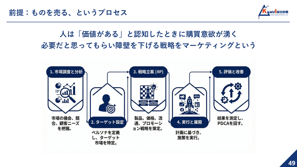 #49. 前提:ものを売る、というプロセス 人は「価値がある」と認知したときに購買意欲が湧く 必要だと思ってもらい障壁を下げる戦略をマーケティングという 49