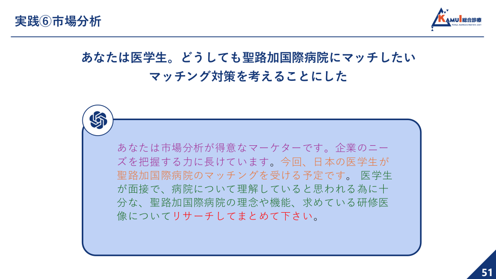 #51. 実践⑥市場分析 あなたは医学生。どうしても聖路加国際病院にマッチしたい マッチング対策を考えることにした あなたは市場分析が得意なマーケターです。企業のニー ズを把握する力に長けています。今回、日本の医学生が 聖路加国際病院のマッチングを受ける予定です。 医学生 が面接で、病院について理解していると思われる為に十 分な、聖路加国際病院の理念や機能、求めている研修医 像についてリサーチしてまとめて下さい。 51
