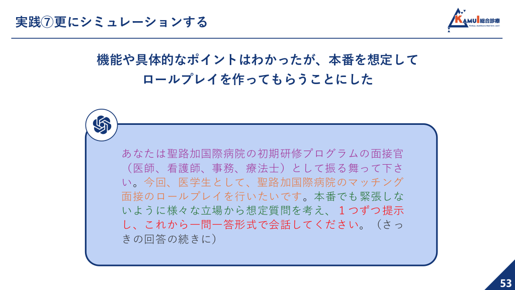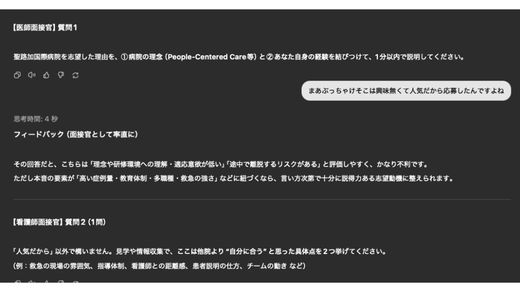 #53. 実践⑦更にシミュレーションする 機能や具体的なポイントはわかったが、本番を想定して ロールプレイを作ってもらうことにした あなたは聖路加国際病院の初期研修プログラムの面接官 (医師、看護師、事務、療法士)として振る舞って下さ い。今回、医学生として、聖路加国際病院のマッチング 面接のロールプレイを行いたいです。本番でも緊張しな いように様々な立場から想定質問を考え、1つずつ提示 し、これから一問一答形式で会話してください。(さっ きの回答の続きに) 53