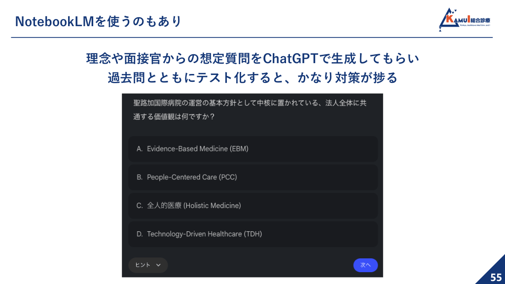 #55. NotebookLMを使うのもあり 理念や面接官からの想定質問をChatGPTで生成してもらい 過去問とともにテスト化すると、かなり対策が捗る 55
