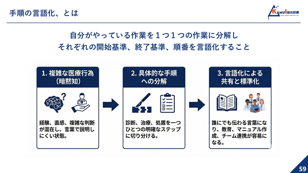 #59. 手順の言語化、とは 自分がやっている作業を1つ1つの作業に分解し それぞれの開始基準、終了基準、順番を言語化すること 59