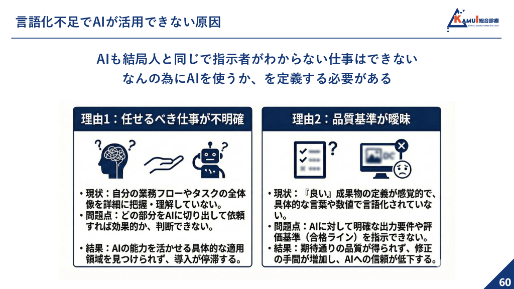 #60. 言語化不足でAIが活用できない原因 AIも結局人と同じで指示者がわからない仕事はできない なんの為にAIを使うか、を定義する必要がある 60