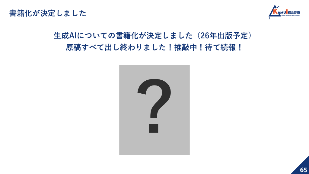 #65. 書籍化が決定しました 生成AIについての書籍化が決定しました(26年出版予定) 原稿すべて出し終わりました!推敲中!待て続報! ? 65