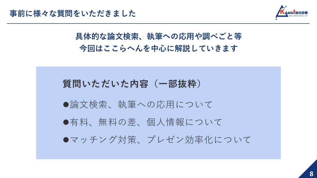 #8. 事前に様々な質問をいただきました 具体的な論文検索、執筆への応用や調べごと等 今回はここらへんを中心に解説していきます 質問いただいた内容(一部抜粋) ⚫論文検索、執筆への応用について ⚫有料、無料の差、個人情報について ⚫マッチング対策、プレゼン効率化について 8