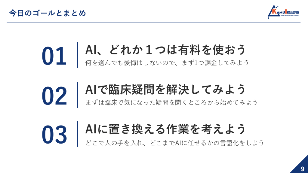 #9. 今日のゴールとまとめ 01 AI、どれか1つは有料を使おう 02 AIで臨床疑問を解決してみよう 03 AIに置き換える作業を考えよう 何を選んでも後悔はしないので、まず1つ課金してみよう まずは臨床で気になった疑問を聞くところから始めてみよう どこで人の手を入れ、どこまでAIに任せるかの言語化をしよう 9