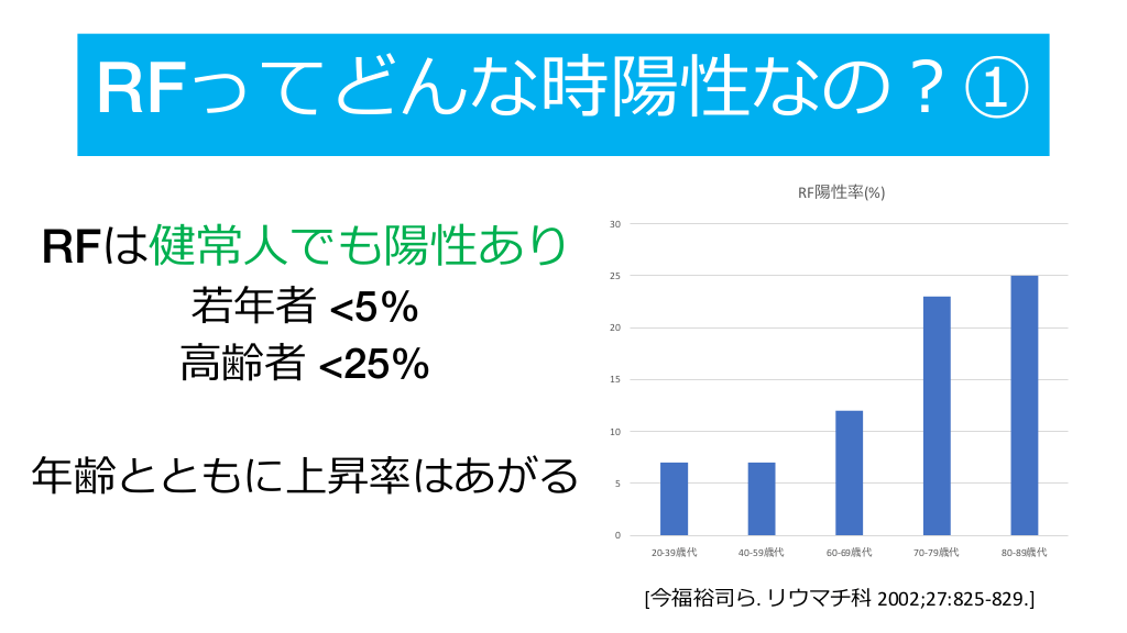#4. RFってどんな時陽性なの︖① RF陽性率(%) RFは健常⼈でも陽性あり 若年者 <5% ⾼齢者 <25% 30 25 20 15 10 年齢とともに上昇率はあがる 5 0 20-39歳代 40-59歳代 60-69歳代 70-79歳代 80-89歳代 [今福裕司ら. リウマチ科 2002;27:825-829.]