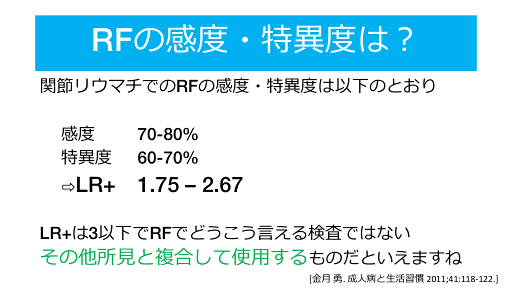 #6. RFの感度・特異度は︖ 関節リウマチでのRFの感度・特異度は以下のとおり 感度 特異度 70-80% 60-70% ⇨LR+ 1.75 – 2.67 LR+は3以下でRFでどうこう⾔える検査ではない その他所⾒と複合して使⽤するものだといえますね [⾦⽉ 勇. 成⼈病と⽣活習慣 2011;41:118-122.]