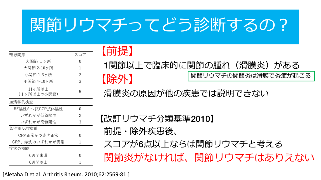 #7. 関節リウマチってどう診断するの︖ 罹患関節 スコア ⼤関節 1ヶ所 0 ⼤関節 2-10ヶ所 1 ⼩関節 1-3ヶ所 2 ⼩関節 4-10ヶ所 3 11ヶ所以上 (1ヶ所以上の⼩関節) 5 ⾎清学的検査 RF陰性かつ抗CCP抗体陰性 0 いずれかが低値陽性 2 いずれかが⾼値陽性 3 急性期反応物質 CRP正常かつ⾚沈正常 0 CRP、⾚沈のいずれかが異常 1 症状の持続 6週間未満 0 6週間以上 1 【前提】 1関節以上で臨床的に関節の腫れ(滑膜炎)がある 【除外】 関節リウマチの関節炎は滑膜で炎症が起こる 滑膜炎の原因が他の疾患では説明できない 【改訂リウマチ分類基準2010】 前提・除外疾患後、 スコアが6点以上ならば関節リウマチと考える 関節炎がなければ、関節リウマチはありえない [Aletaha D et al. Arthritis Rheum. 2010;62:2569-81.]