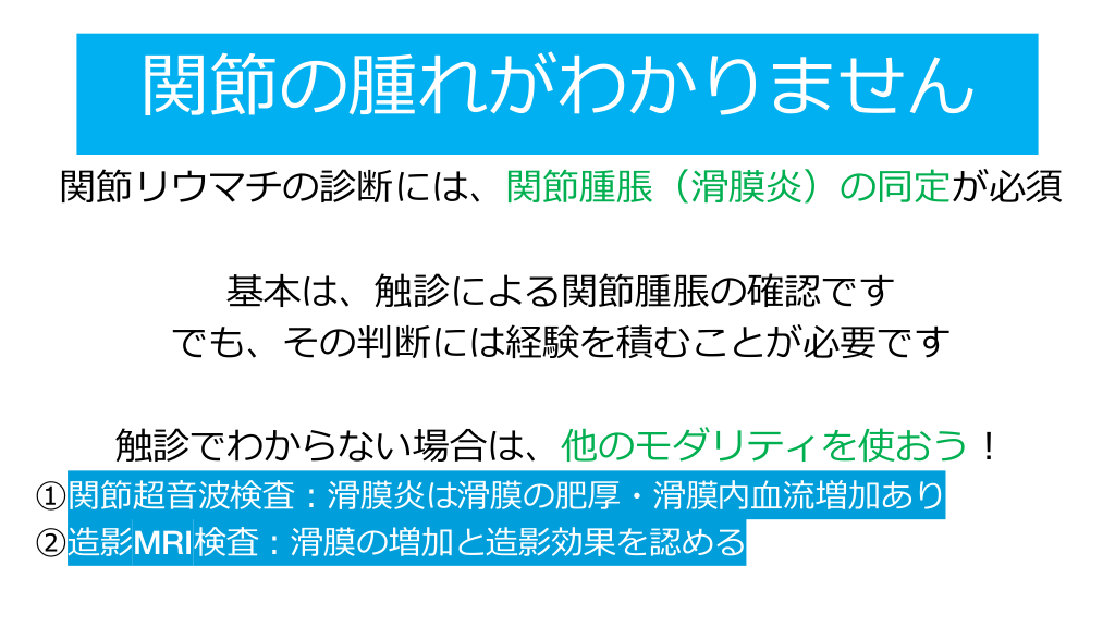 #8. 関節の腫れがわかりません 関節リウマチの診断には、関節腫脹(滑膜炎)の同定が必須 基本は、触診による関節腫脹の確認です でも、その判断には経験を積むことが必要です 触診でわからない場合は、他のモダリティを使おう︕ ①関節超⾳波検査︓滑膜炎は滑膜の肥厚・滑膜内⾎流増加あり ②造影MRI検査︓滑膜の増加と造影効果を認める