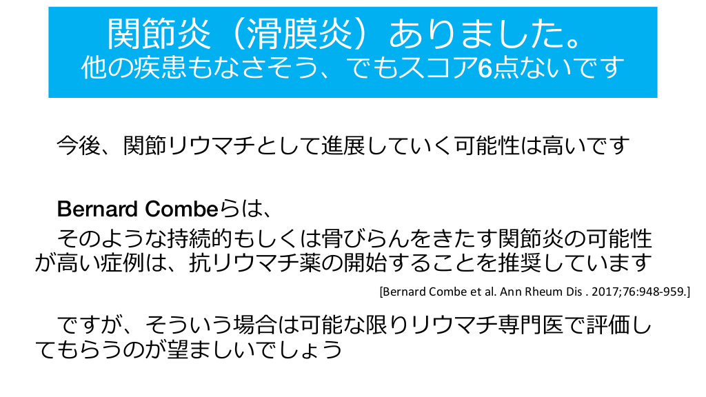#9. 関節炎(滑膜炎)ありました。 他の疾患もなさそう、でもスコア6点ないです 今後、関節リウマチとして進展していく可能性は⾼いです Bernard Combeらは、 そのような持続的もしくは⾻びらんをきたす関節炎の可能性 が⾼い症例は、抗リウマチ薬の開始することを推奨しています [Bernard Combe et al. Ann Rheum Dis . 2017;76:948-959.] ですが、そういう場合は可能な限りリウマチ専⾨医で評価し てもらうのが望ましいでしょう