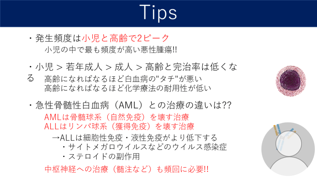 ALLはリンパ球系(獲得免疫)を壊す治療 ・小児 > 若年成人 > 成人 > 高齢と完治率は低くなる ・急性骨髄性白血病(AML)との治療の違いは?? →ALLは細胞性免疫・液性免疫がより低下する