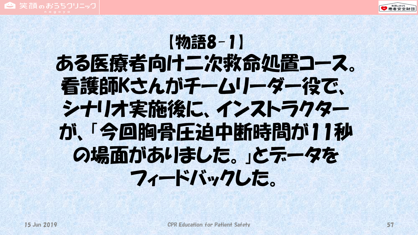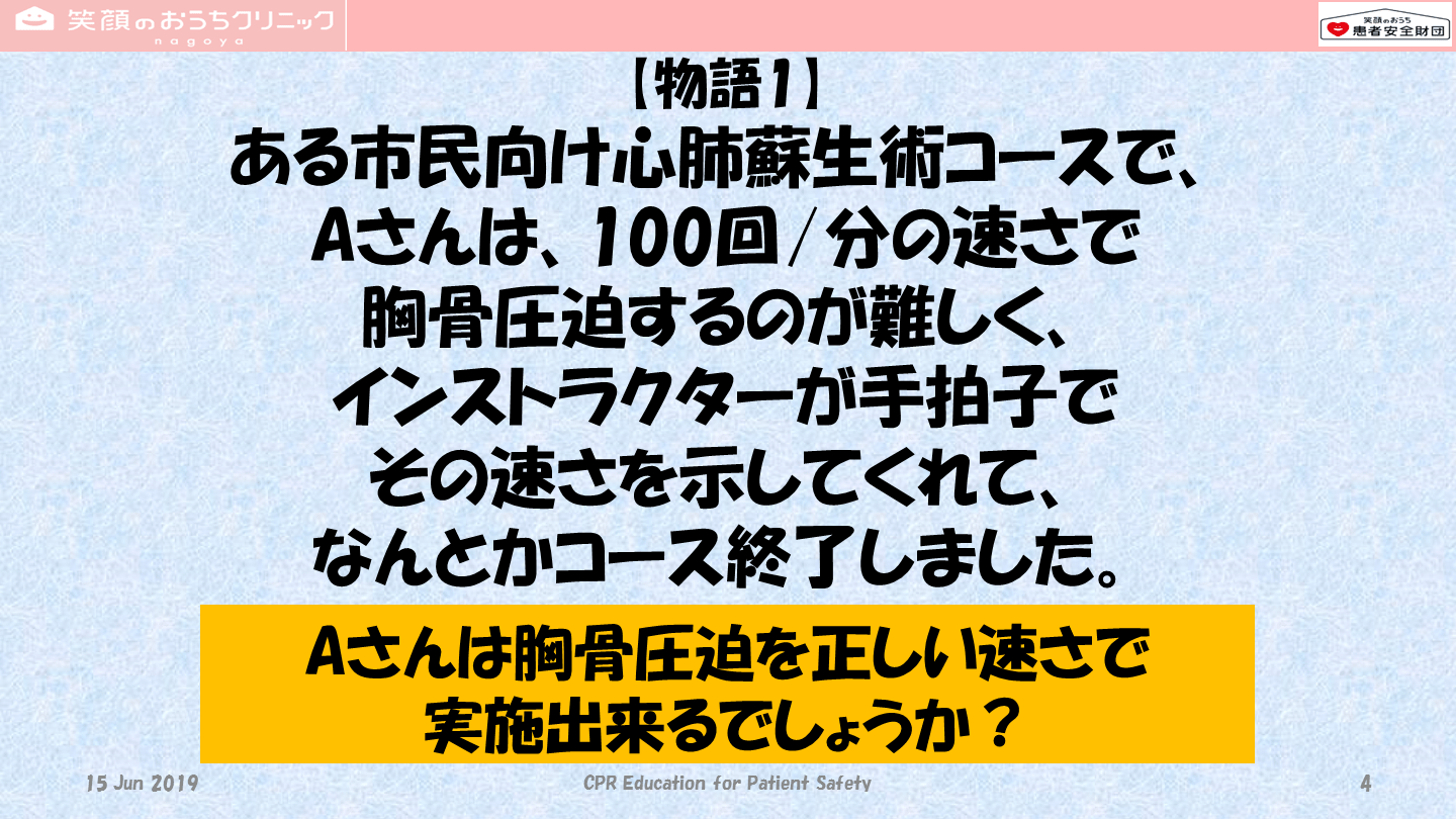 【物語1】ある市民向け心肺蘇生術コースで、Aさんは、100回/分の速さで胸骨圧迫するのが難しく、インストラクターが手拍子でその速さを示してくれて、なんとかコース終了しました。 CPR Education for Patient Safety 4 15 Jun 2019 Aさんは胸骨圧迫を正しい速さで