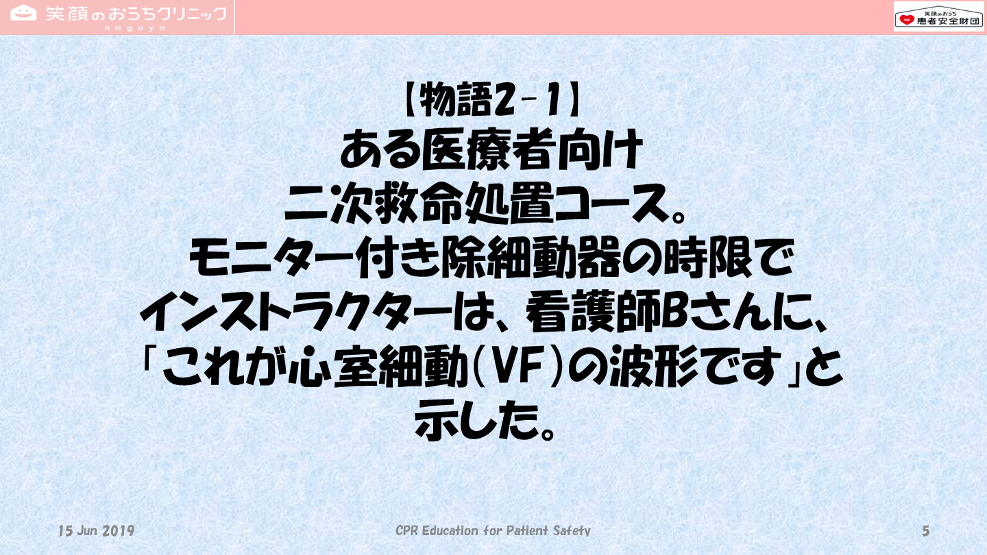 【物語2-1】ある医療者向け二次救命処置コース。モニター付き除細動器の時限でインストラクターは、看護師Bさんに、「これが心室細動(VF)の波形です」と示した。 CPR Education for Patient Safety 5 15 Jun 2019 #6.