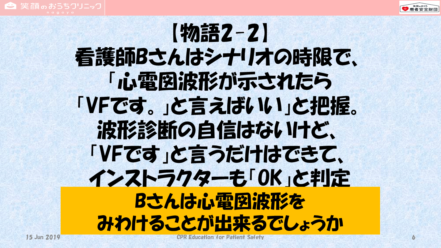 【物語2-2】看護師Bさんはシナリオの時限で、「心電図波形が示されたら「VFです。」と言えばいい」と把握。波形診断の自信はないけど、「VFです」と言うだけはできて、インストラクターも「OK」と判定 CPR Education for Patient Safety 6 15 Jun 2019 Bさんは心電図波形を