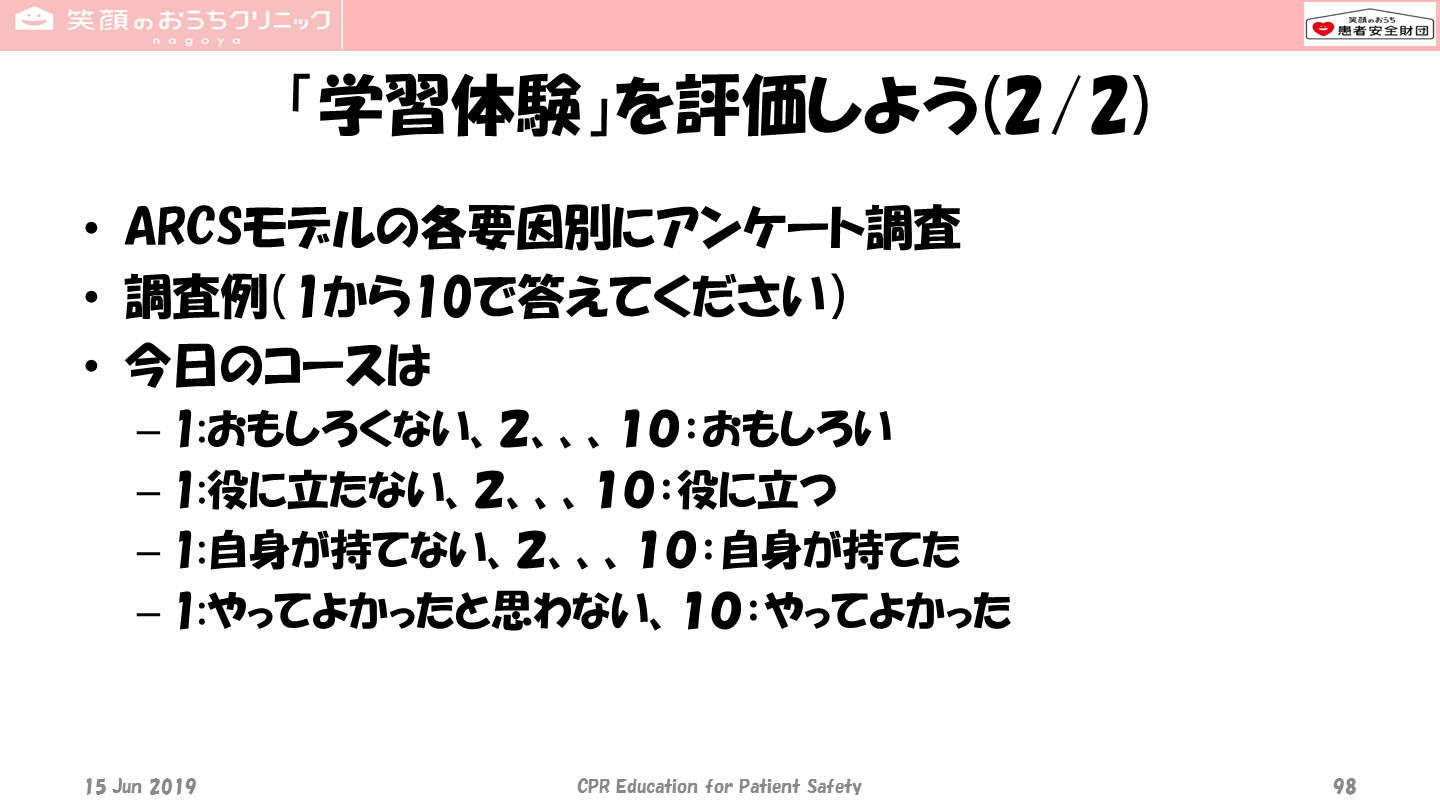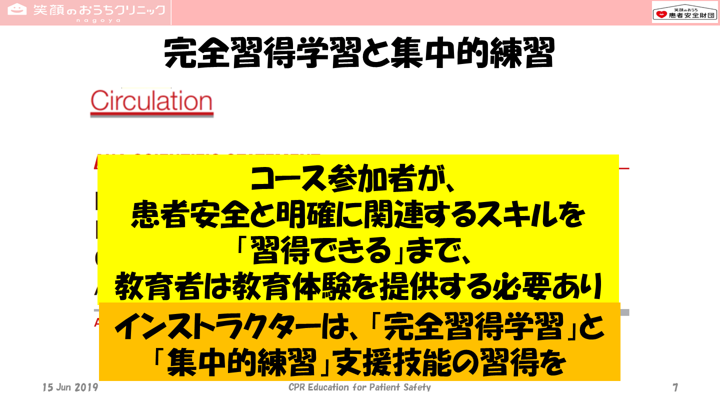 完全習得学習と集中的練習 15 Jun 2019 CPR Education for Patient Safety 7 コース参加者が、