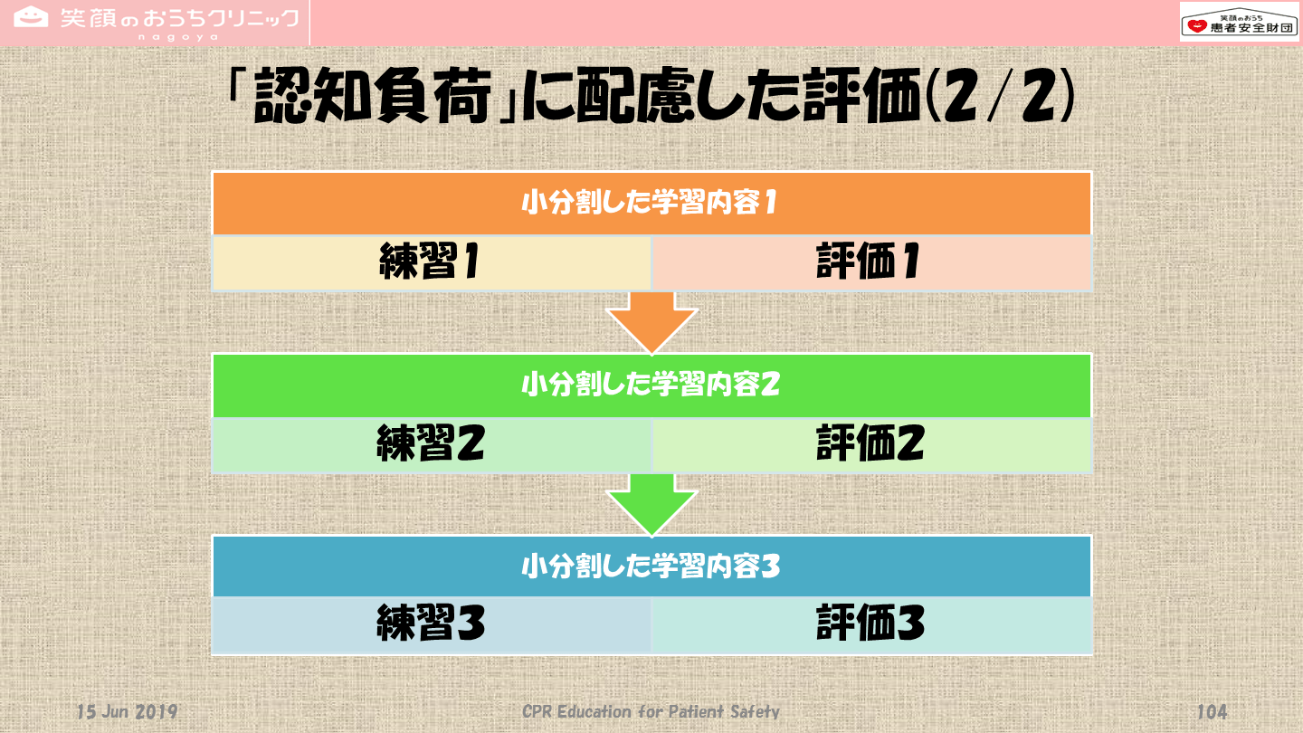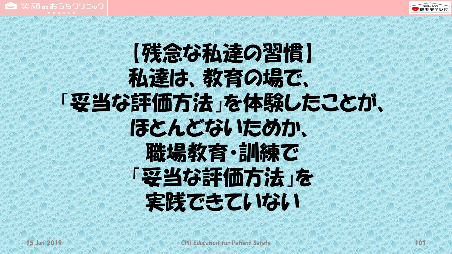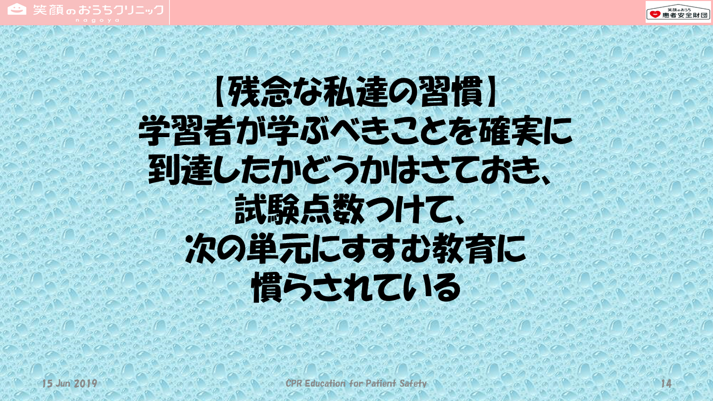 【残念な私達の習慣】学習者が学ぶべきことを確実に到達したかどうかはさておき、試験点数つけて、次の単元にすすむ教育に慣らされている CPR Education for Patient Safety 14 15 Jun 2019 #15.