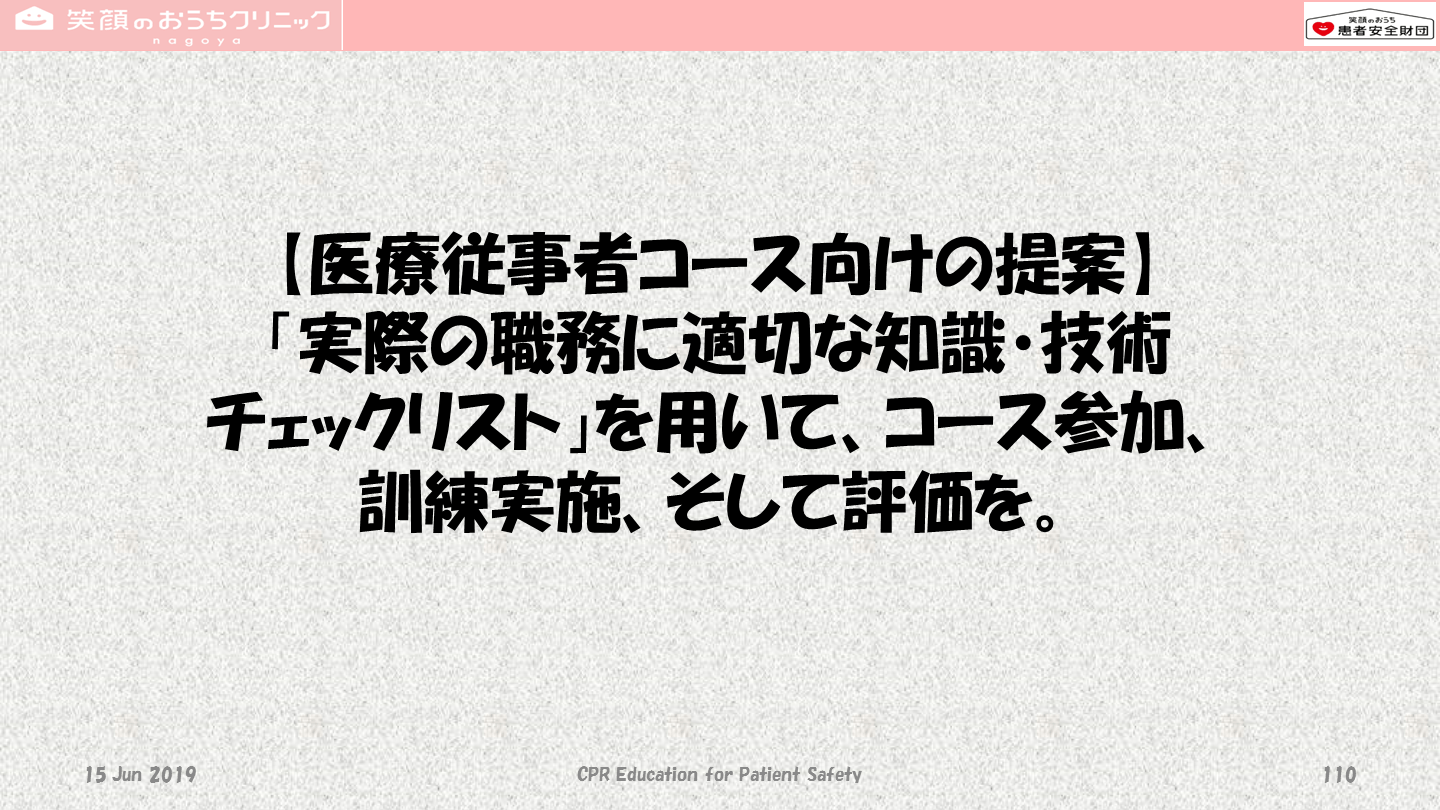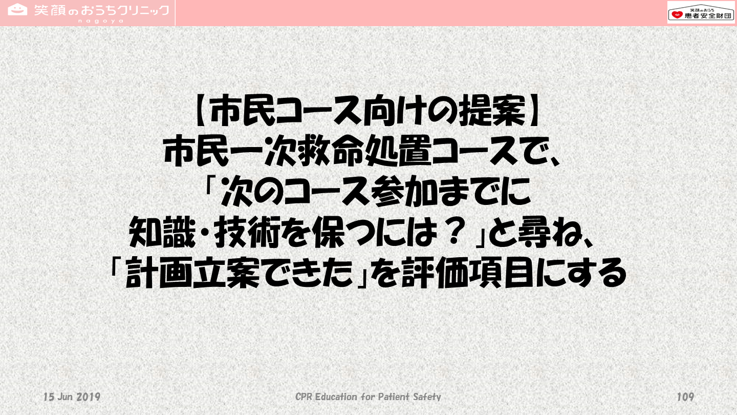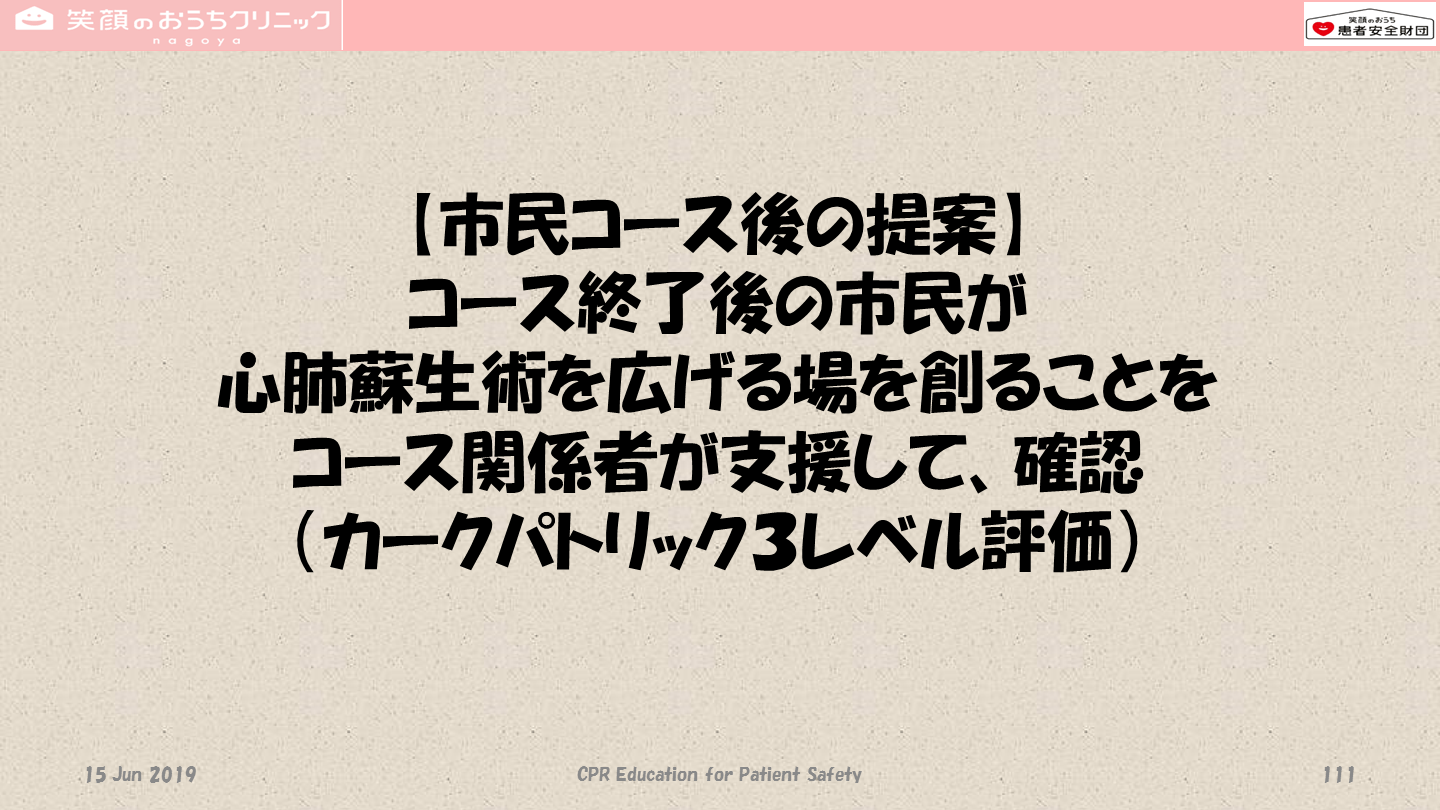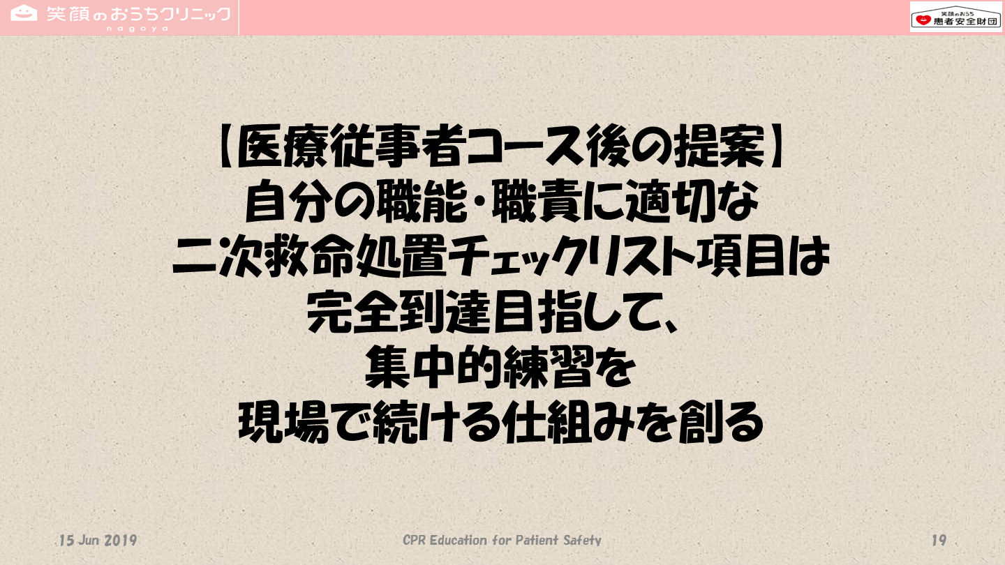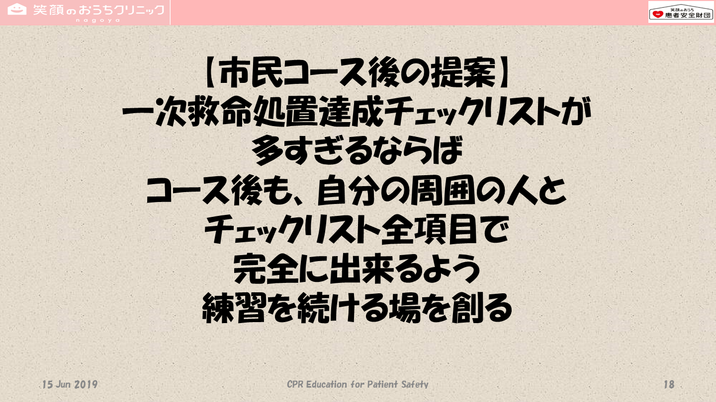 【市民コース後の提案】一次救命処置達成チェックリストが多すぎるならばコース後も、自分の周囲の人とチェックリスト全項目で完全に出来るよう練習を続ける場を創る CPR Education for Patient Safety 18 15 Jun 2019 #19.