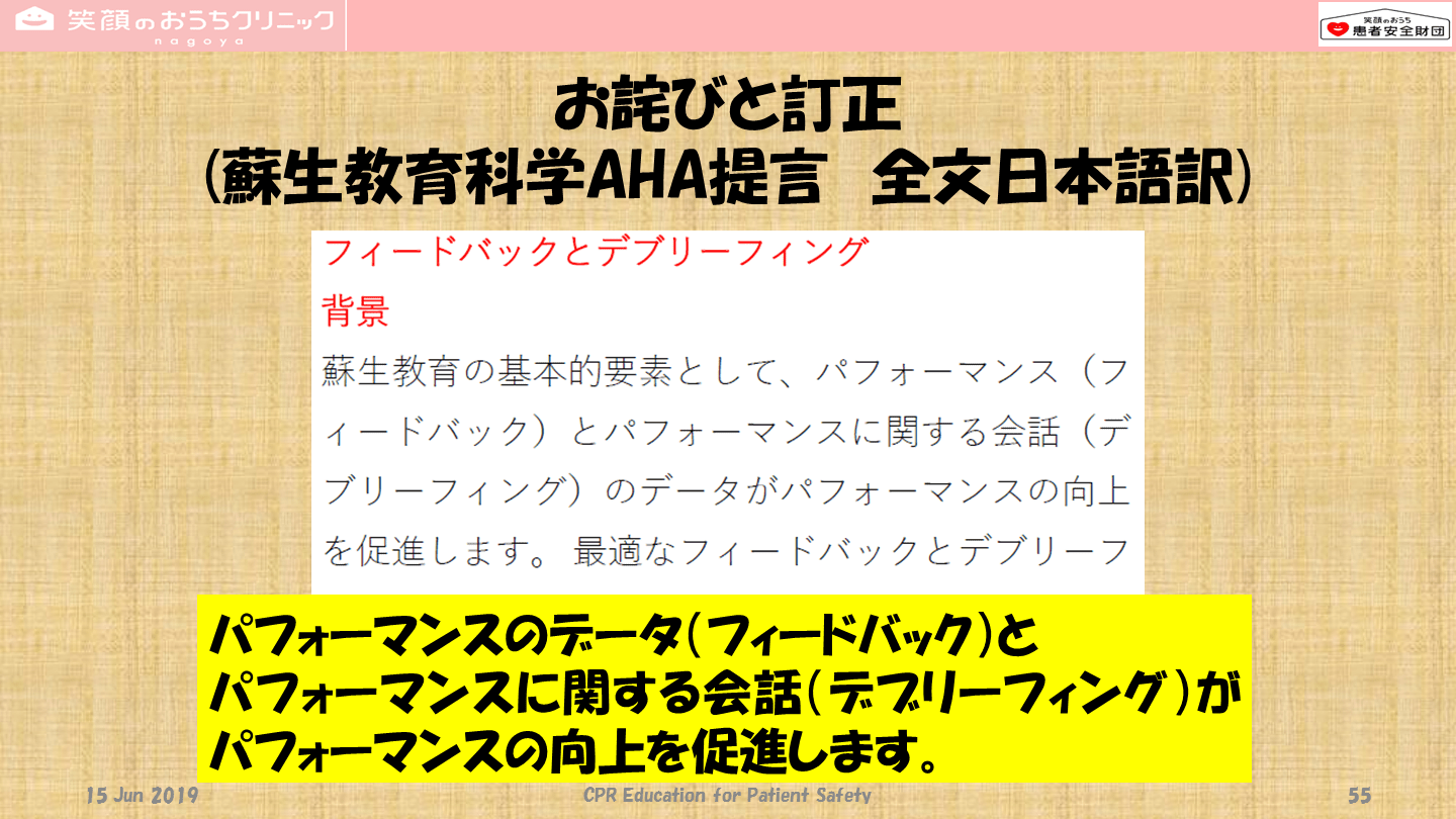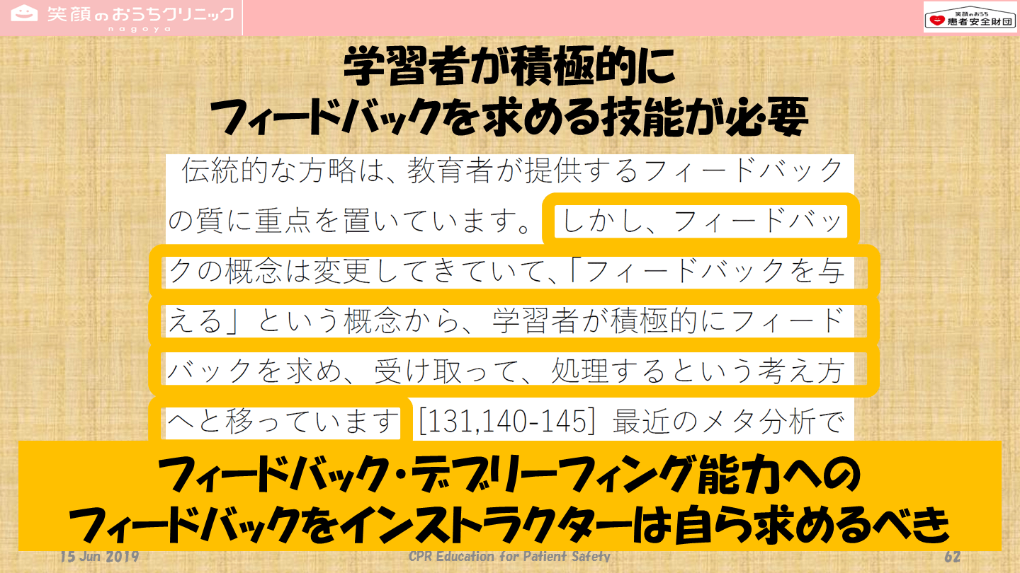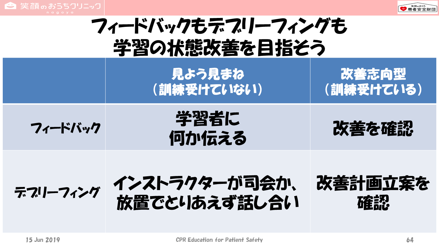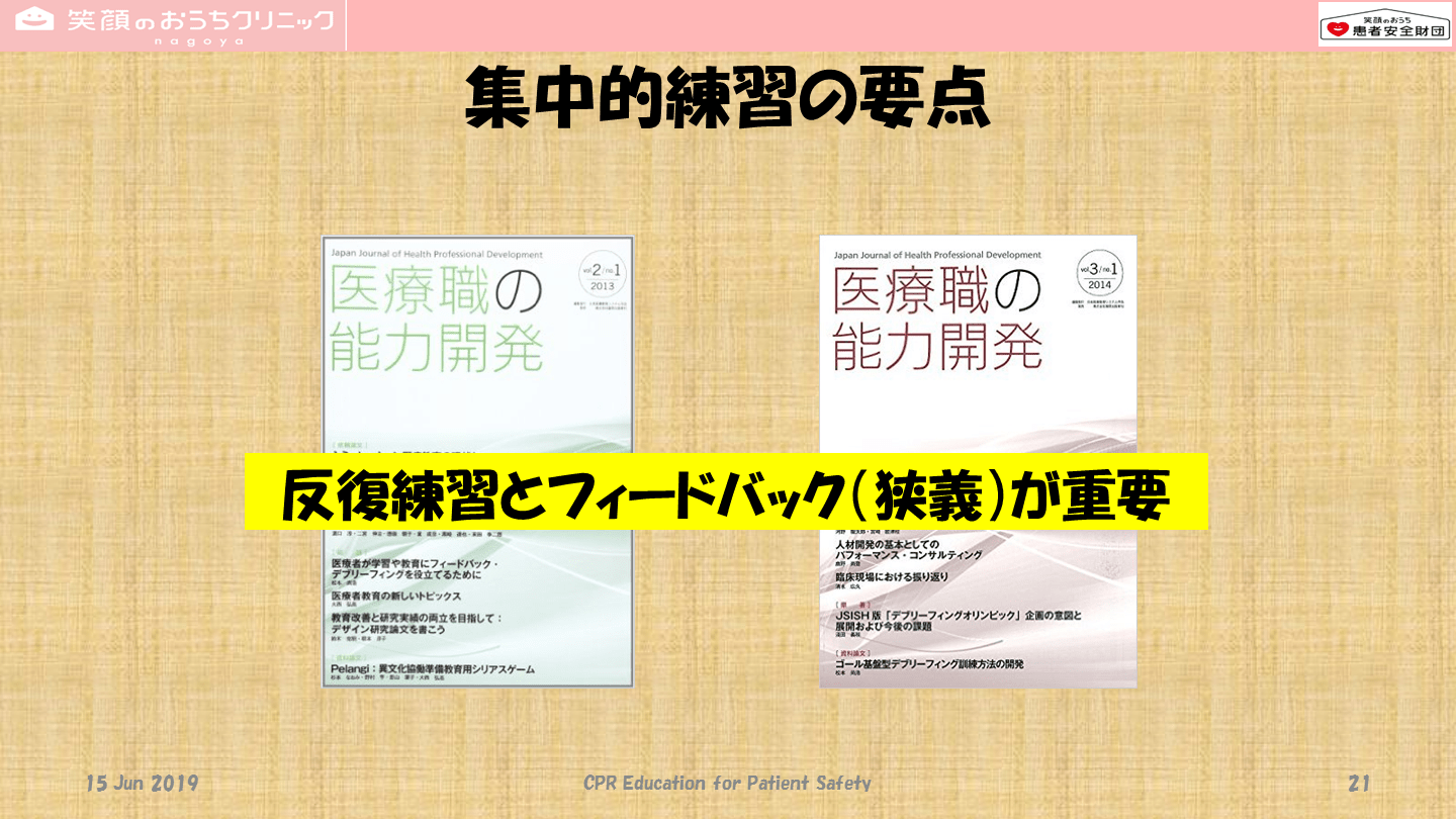 【医療従事者コース後の提案】自分の職能・職責に適切な二次救命処置チェックリスト項目は完全到達目指して、集中的練習を現場で続ける仕組みを創る CPR Education for Patient Safety 19 15 Jun 2019 フィードバックとデブリーフィングの重要性 #20.