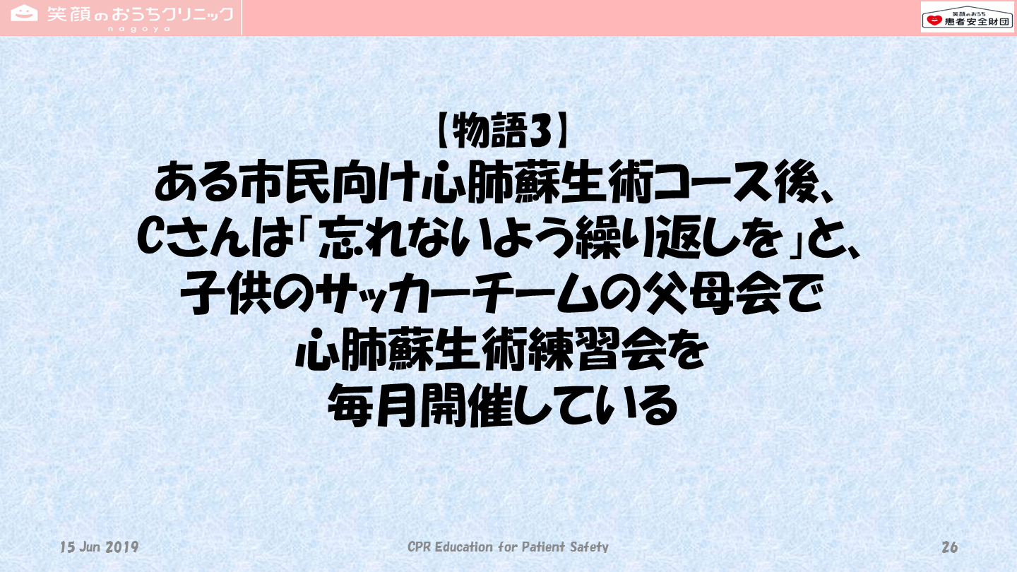 【物語3】ある市民向け心肺蘇生術コース後、Cさんは「忘れないよう繰り返しを」と、子供のサッカーチームの父母会で心肺蘇生術練習会を毎月開催している CPR Education for Patient Safety 26 15 Jun 2019 #27.