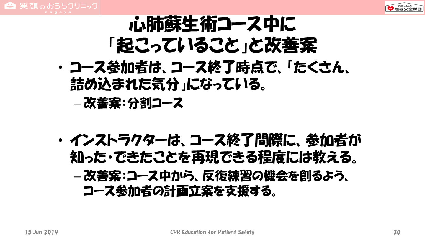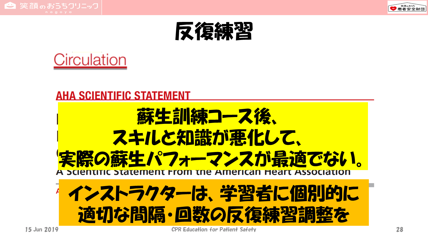反復練習 15 Jun 2019 CPR Education for Patient Safety 28 蘇生訓練コース後、