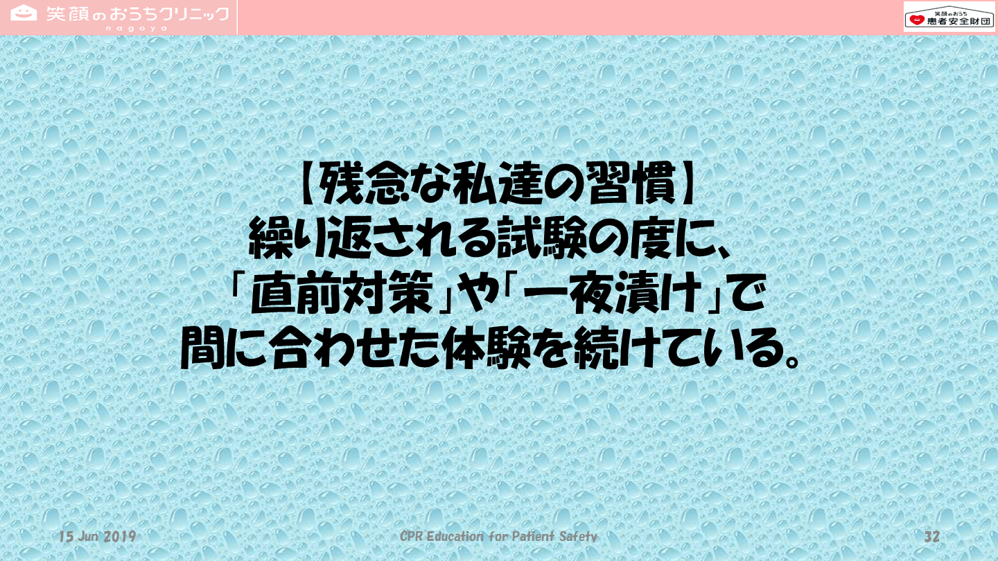 【残念な私達の習慣】繰り返される試験の度に、「直前対策」や「一夜漬け」で間に合わせた体験を続けている。 CPR Education for Patient Safety 32 15 Jun 2019 #33.