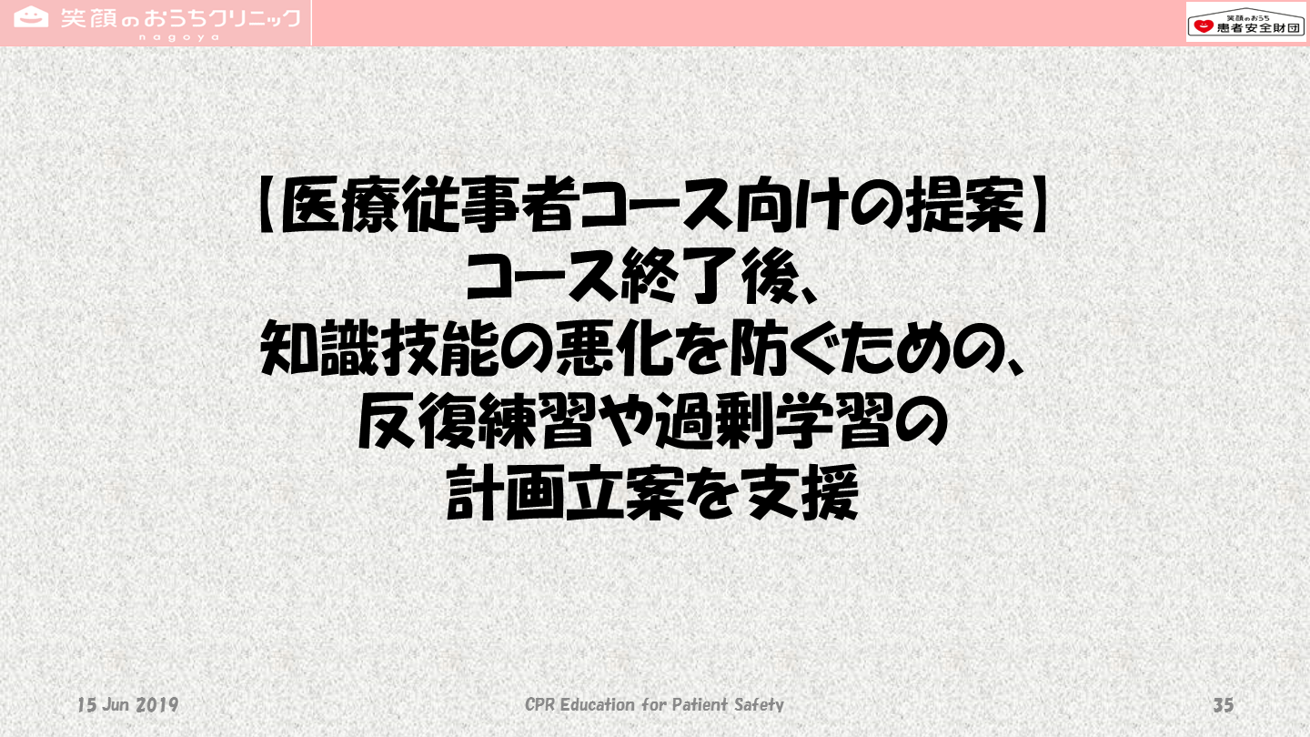 【医療従事者コース向けの提案】コース終了後、知識技能の悪化を防ぐための、反復練習や過剰学習の計画立案を支援 CPR Education for Patient Safety 35 15 Jun 2019 #36.